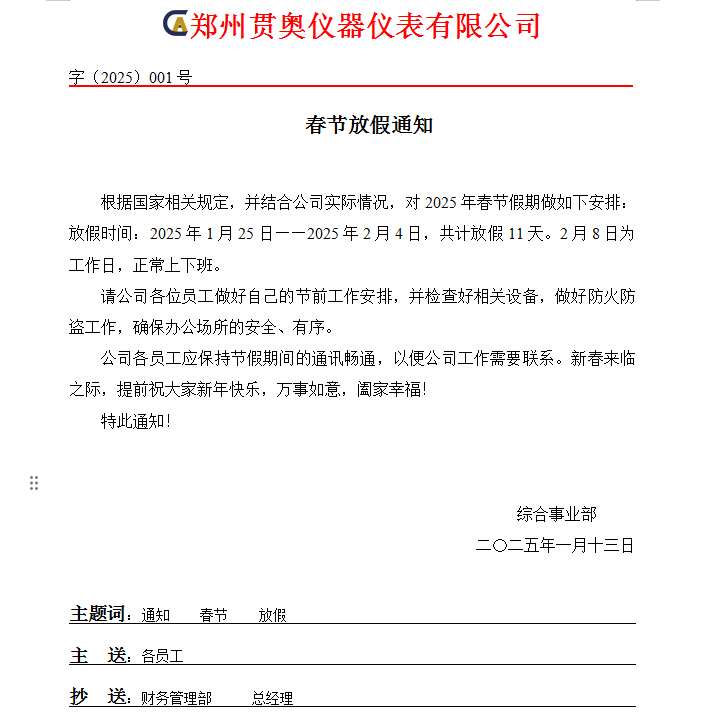 根據(jù)國家法定節(jié)假日安排,結(jié)合公司實際情況,2025年春節(jié)假期具體安排如下: