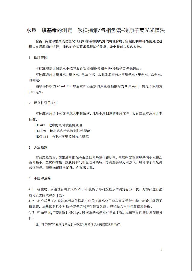 本標準規定了地表水測定、地下水測定、生活污水檢測、工業廢水檢測和海水中烷基汞的吹掃捕集/氣相色譜-冷原子熒光光譜法。本標準的附錄A為資料性附錄。 本標準為首次發布。