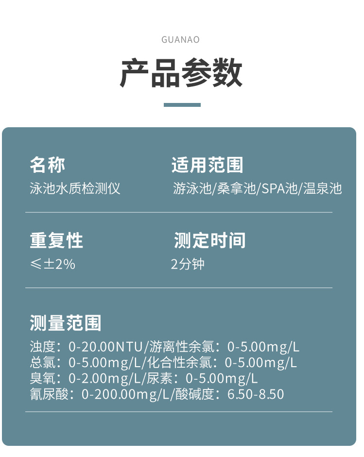 1、相比于傳統(tǒng)的試劑試紙測(cè)定,貫奧泳池水質(zhì)檢測(cè)箱的檢測(cè)數(shù)據(jù)更準(zhǔn)確,檢測(cè)速度更快。